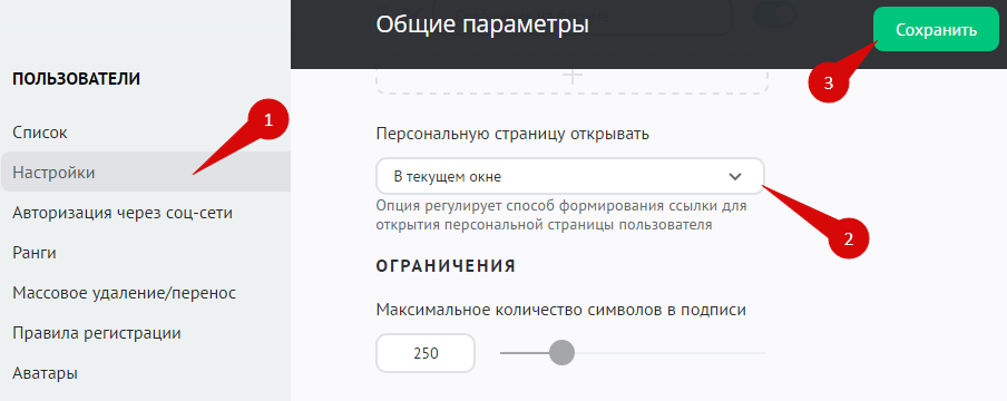 Да, сделать это вы можете в разделе настроек модуля: Панель управления — Пользователи — Настройки (1). Для опции «Персональную страницу пользователя открывать» укажите значение «В текущем окне» (2) и нажмите на кнопку «Сохранить» (3):