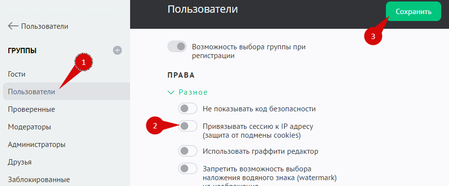 Для этого перейдите в раздел групп пользователей: Панель управления — Пользователи — Группы. Выберите нужную группу пользователей (1) и в подразделе «Разное» отключите опцию «Привязывать сессию к IP-адресу» (2). Нажмите на кнопку «Сохранить» (3).