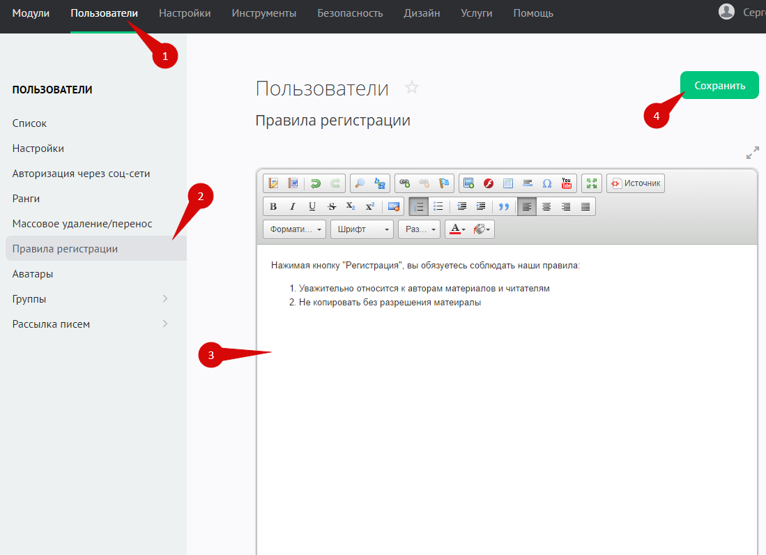 Чтобы написать свой текст правил, зайдите в панель управления сайтом и в главном меню выберите пункт «Пользователи» (1). На открывшейся странице из меню слева перейдите в раздел «Правила регистрации» (2):