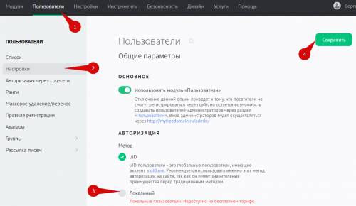 Выбор метода авторизации «Локальные» выполняется на странице Панель управления — Пользователи — Настройки: