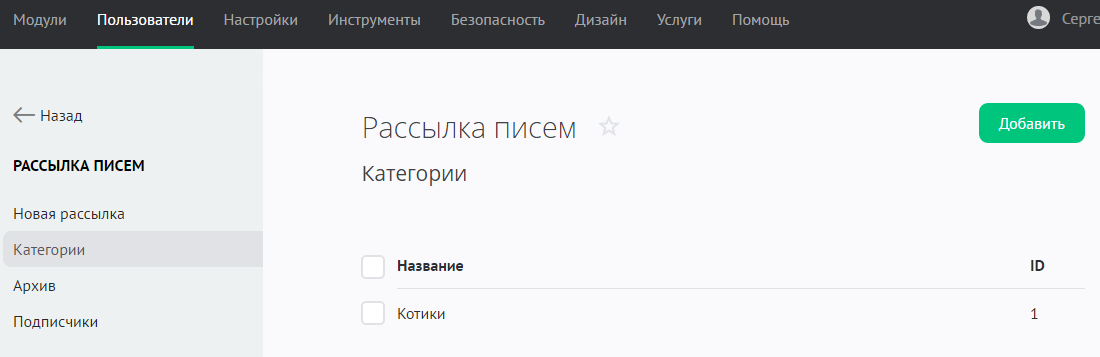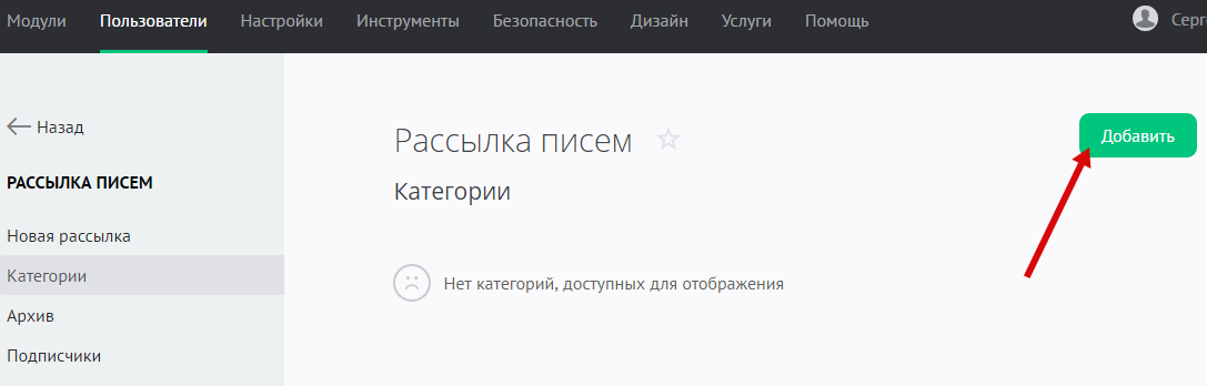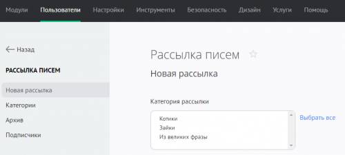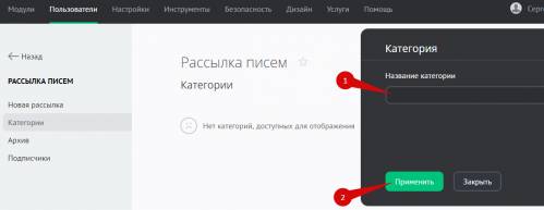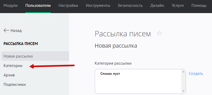 Чтобы создать категорию, зайдите в Панель управления — Пользователи — Рассылка писем — Категории: