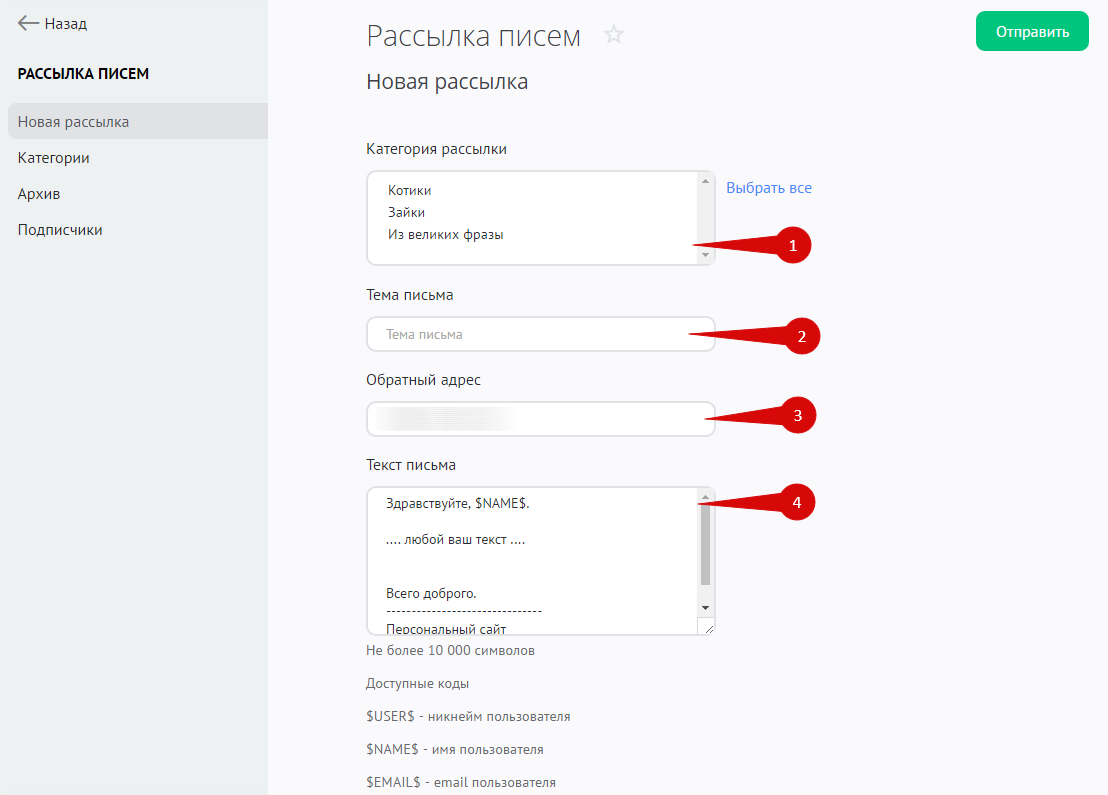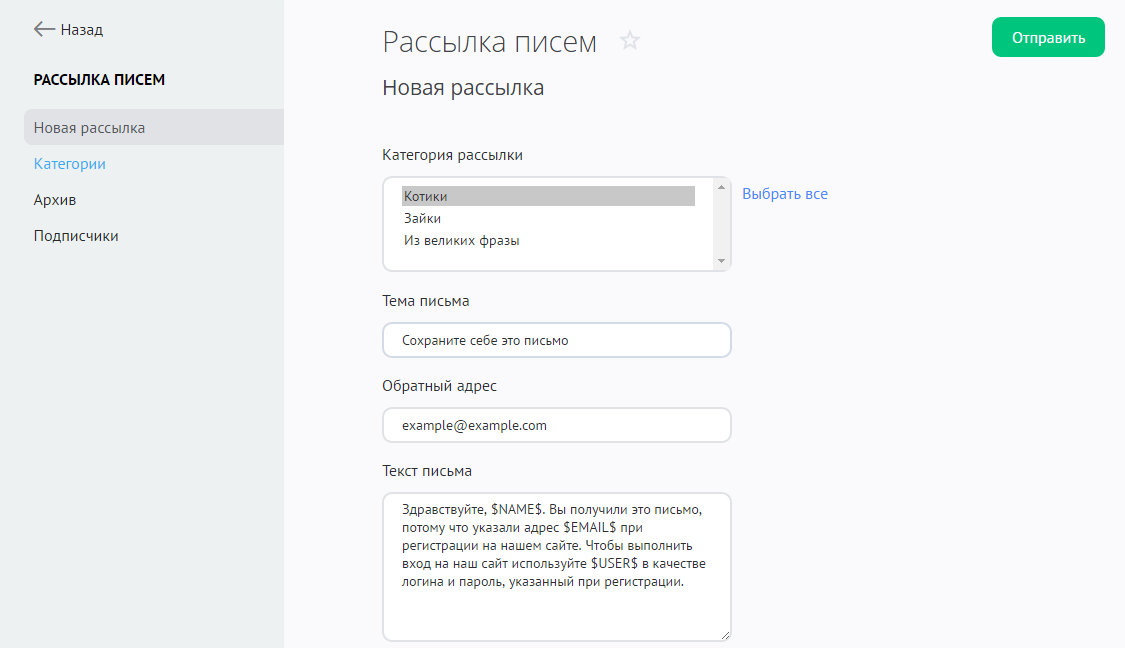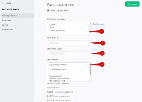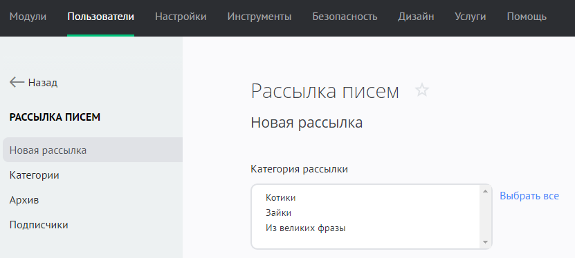 - Категория рассылки — письмо получат те пользователи, которые подписались на выбранную категорию