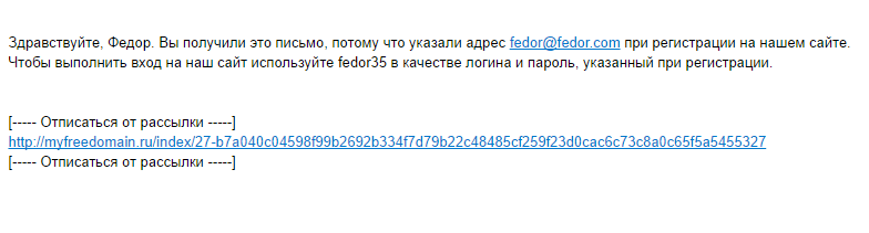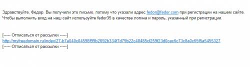 Здравствуйте, Федор. Вы получили это письмо, потому что указали адрес fedor@fedor.com при регистрации на нашем сайте. Чтобы выполнить вход на наш сайт, используйте fedor35 в качестве логина и пароль, указанный при регистрации.