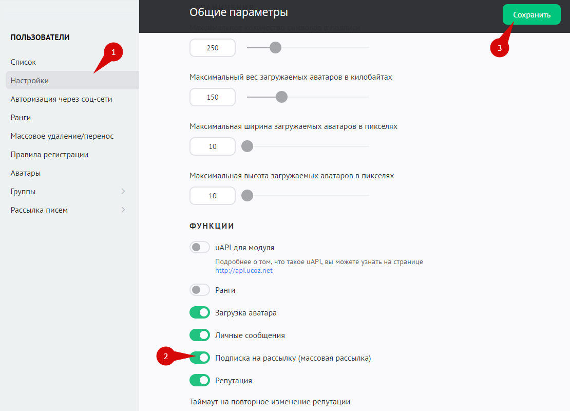 В разделе «Настройки» (1) найдите пункт «Функции» и включите опцию «Подписка на рассылку (массовая рассылка)» (2). Сохраните изменения (3).