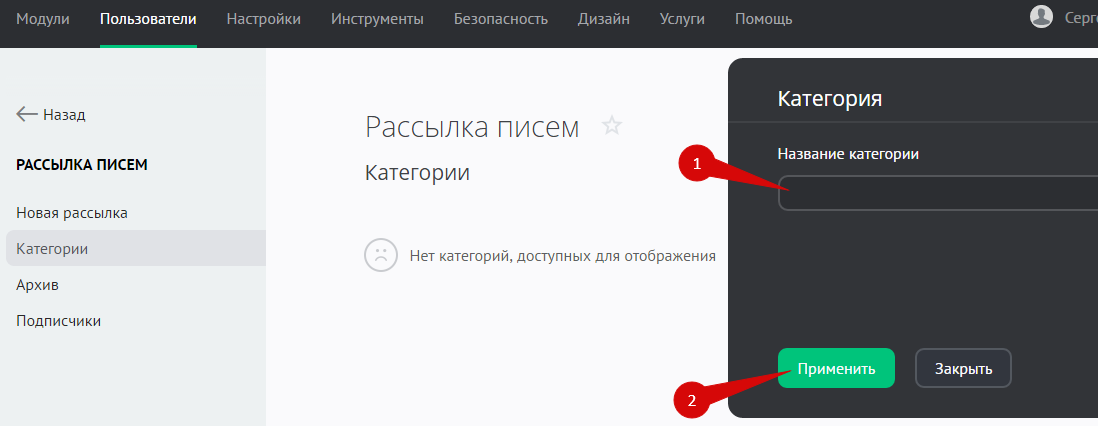 Подберите подходящее название для категории (1) и нажмите на кнопку «Применить» (2):
